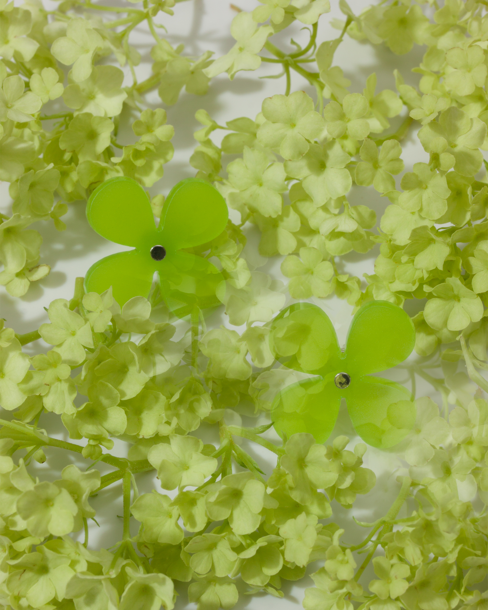 Матовый вечнозеленый плексиглас идеально передает бархатистую мелкодисперсную текстуру цветка четырех-лепестковой гортензии.